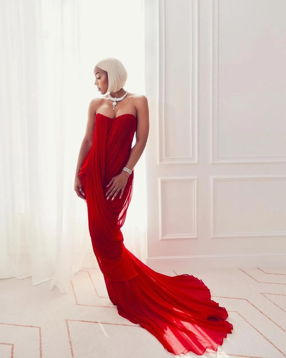 On her first attendance at the Cannes Film Festival 2024, she dazzled in a red custom Anamika Khanna gown and the platinum bob wig she wore worked in her favour because it elevated the look.