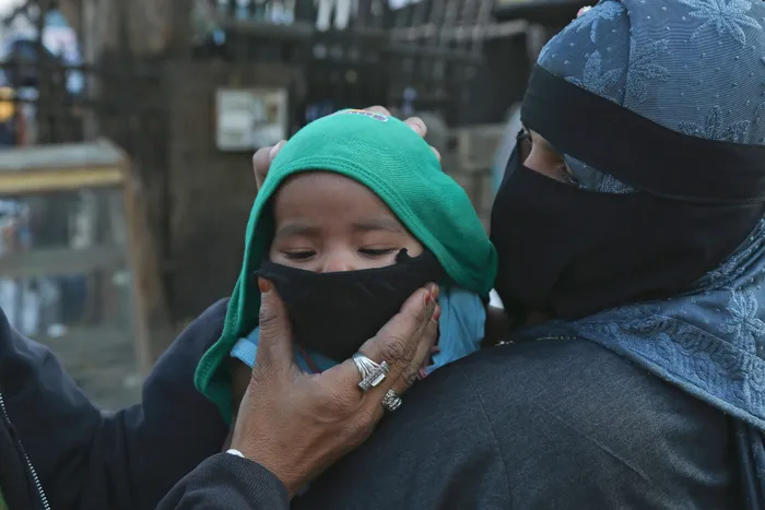 An Indian man adjusts the face mask of his child at a market during lockdown to prevent the spread of new coronavirus in Hyderabad, India. Picture: AP Photo/Mahesh Kumar A. An Indian man adjusts the face mask of his child at a market during lockdown to prevent the spread of new coronavirus in Hyderabad, India. Picture: AP Photo/Mahesh Kumar A.