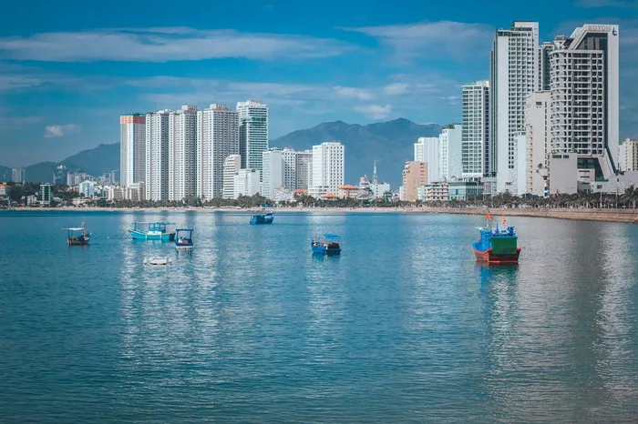 The shore with view of modern skyscrapers of Nha Trang in Vietnam.