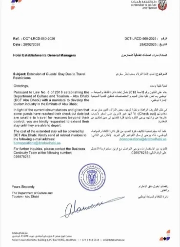 “Abu Dhabi's Department of Culture and Tourism sent a directive to every hotel in the emirate: extend stays for guests who can't leave and send us the invoice. Dubai issued a parallel order hours later. The reason? Airspace closures and mass flight cancellations across the Gulf left over 20,000 passengers stranded.