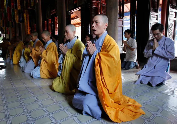Buddhist monks and nuns pray at a ceremony during a summer class in Giang pagoda, outside Hanoi. Picture: REUTERS/Kham